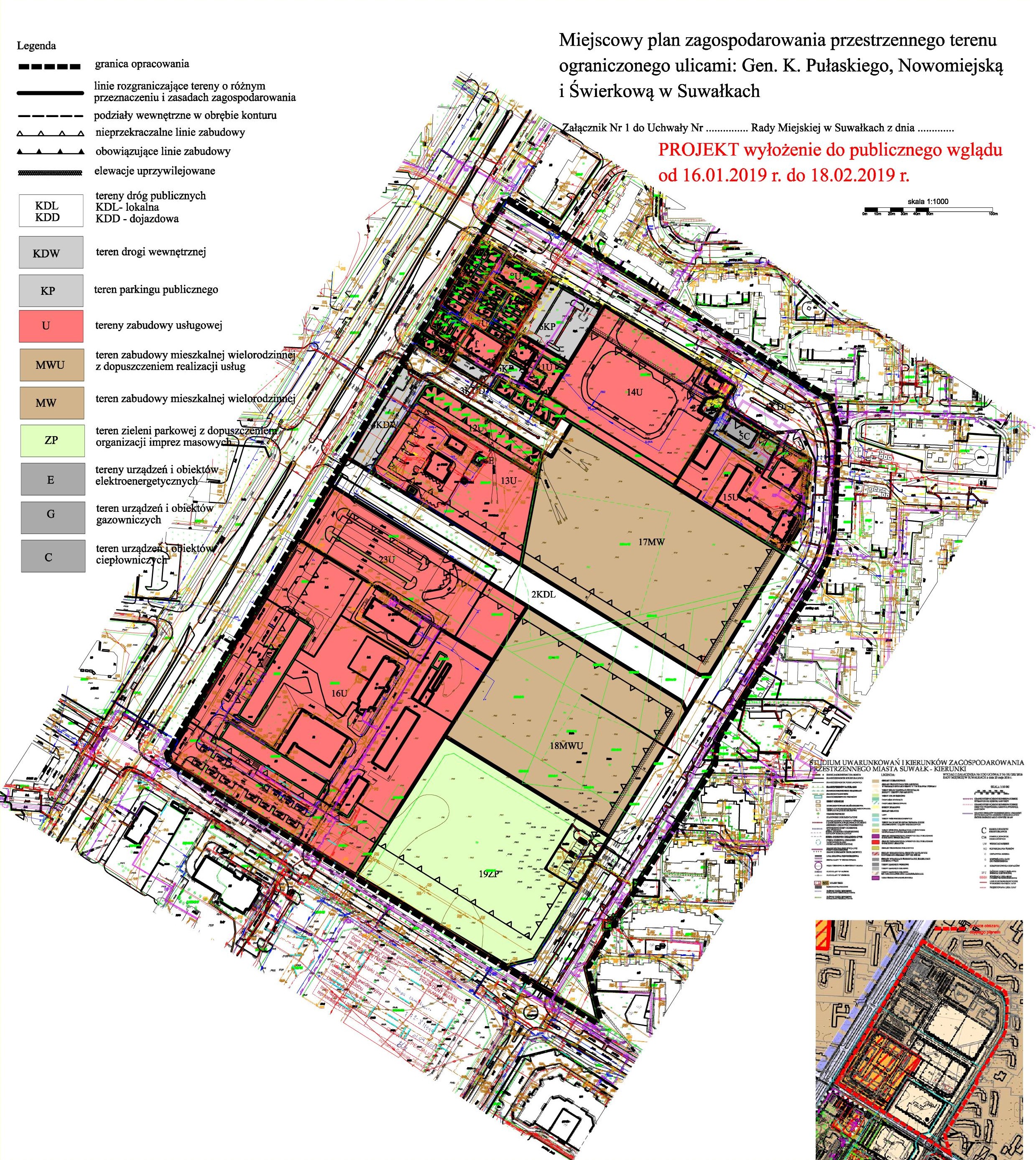Na podstawie art. 17, pkt. 9 ustawy z dnia 27 marca 2003 r. o planowaniu i zagospodarowaniu przestrzennym (Dz. U. z 2018 r., poz. 1945) oraz uchwały Rady Miejskiej w Suwałkach Nr XXXVI/448/2017 z dnia 25 września 2017 r. zawiadamiam o wyłożeniu do publicznego wglądu projektu miejscowego planu zagospodarowania przestrzennego terenu ograniczonego ulicami Gen. K. Pułaskiego, Nowomiejską i Świerkową w Suwałkach wraz z prognozą oddziaływania na środowisko, w dniach od 16.01.2019 r. do 18.02.2019 r. w siedzibie Urzędu Miejskiego w Suwałkach, ul. Mickiewicza 1, pokój 139, w Wydziale Architektury i Gospodarki Przestrzennej w poniedziałki w godzinach od 800 do 1600 w pozostałe dni od 730 do 1530.