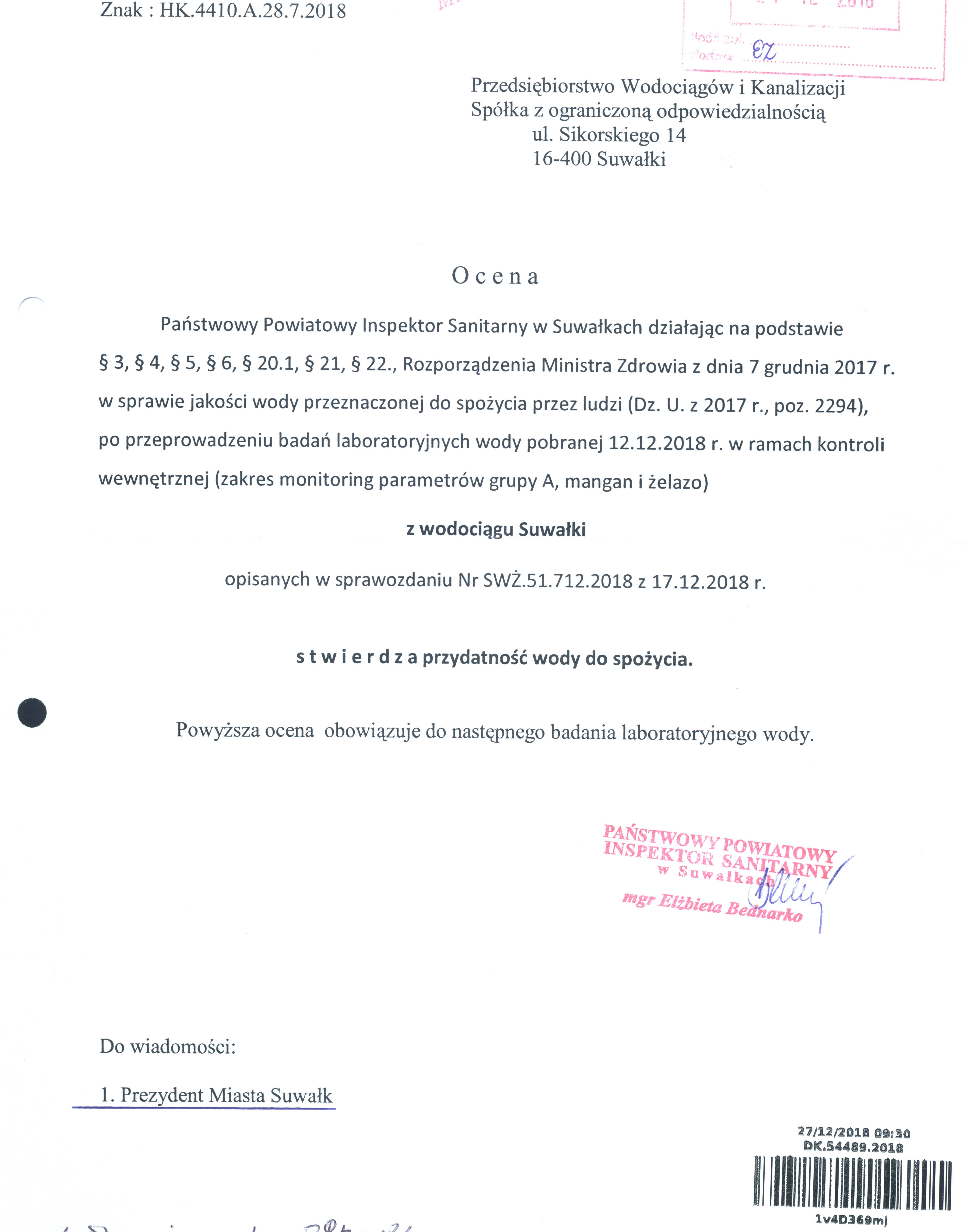 Jakość wody pitnej z wodociągu Suwałki w grudniu 2018 r.