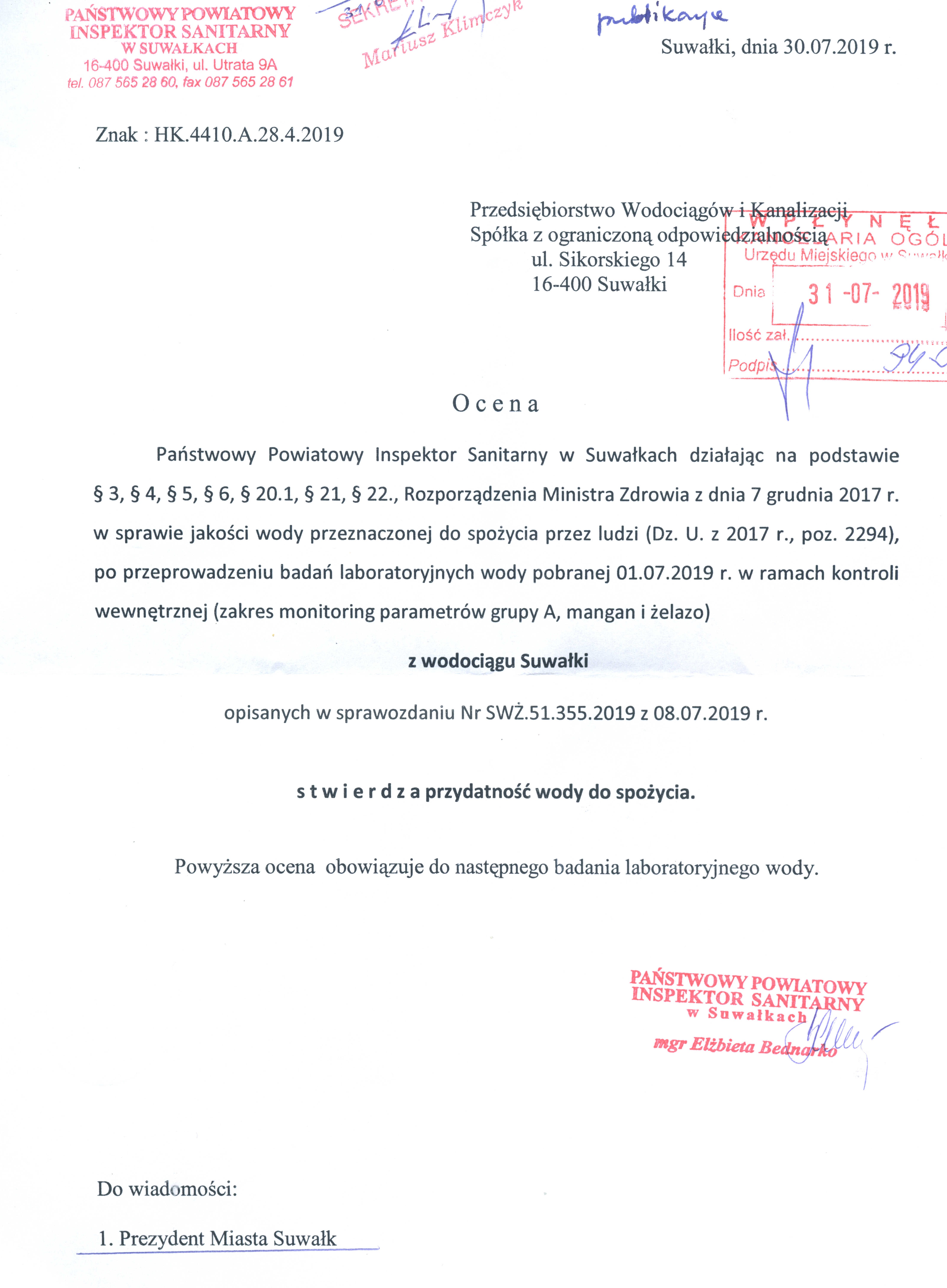 Jakość wody pitnej z ujęcia miejskiego w lipcu 2019 r.
