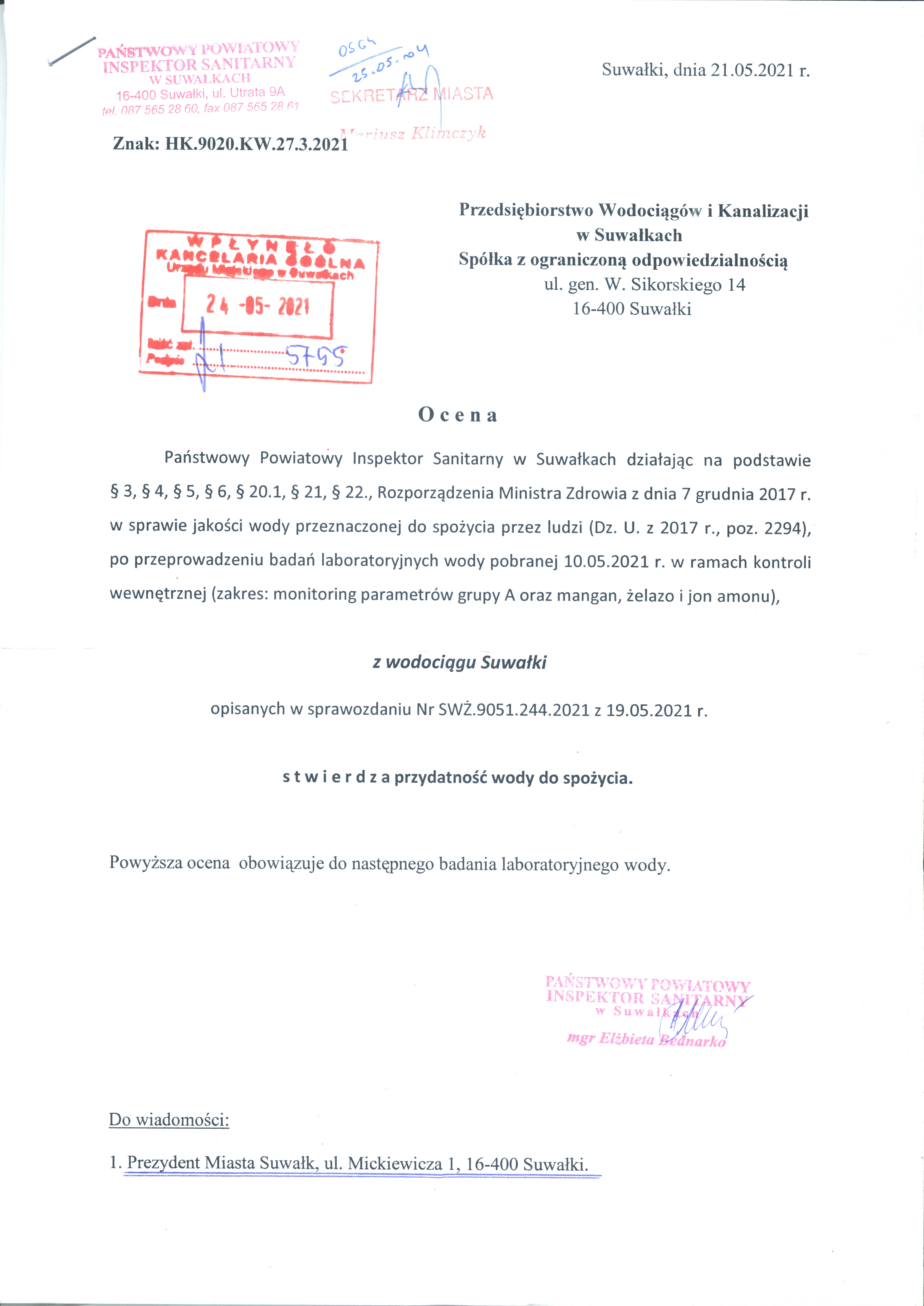 Wyniki badań jakości wody z ujęcia miejskiego w maju 2021 r.