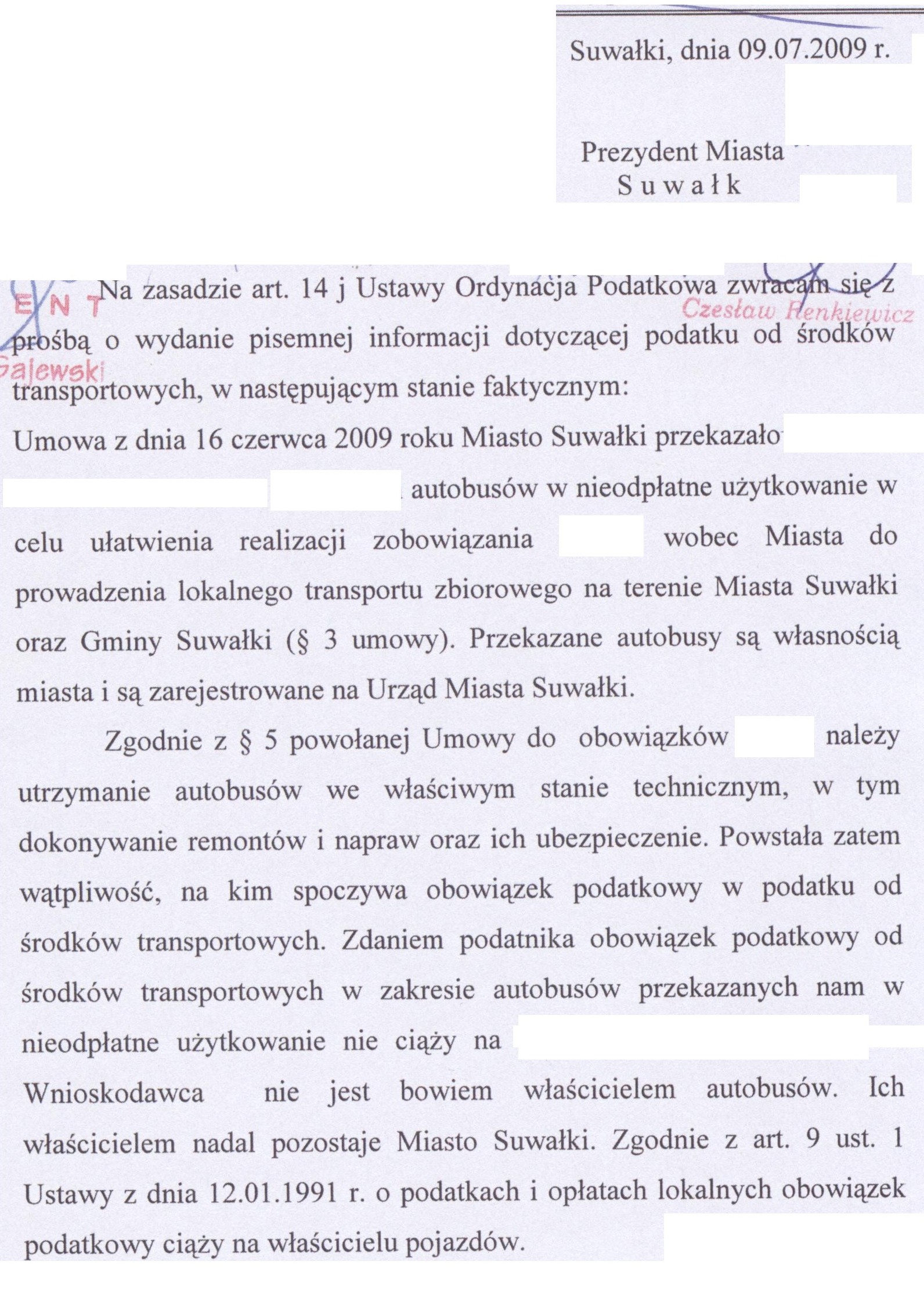 Prezydent Miasta Suwałk działając na podstawie art. 14j § 1 i § 3, ustawy z dnia 29 sierpnia 1997 r. Ordynacja podatkowa (Dz. U. z 2005 r. Nr 8, poz. 60 ze zmianami) po rozpatrzeniu wniosku FIRMY X z dnia 09 lipca 2009 r. o wydanie pisemnej interpretacji przepisów prawa podatkowego dotyczącego podatku od środków transportowych w zakresie określenia podmiotu, na którym ciąży obowiązek podatkowy