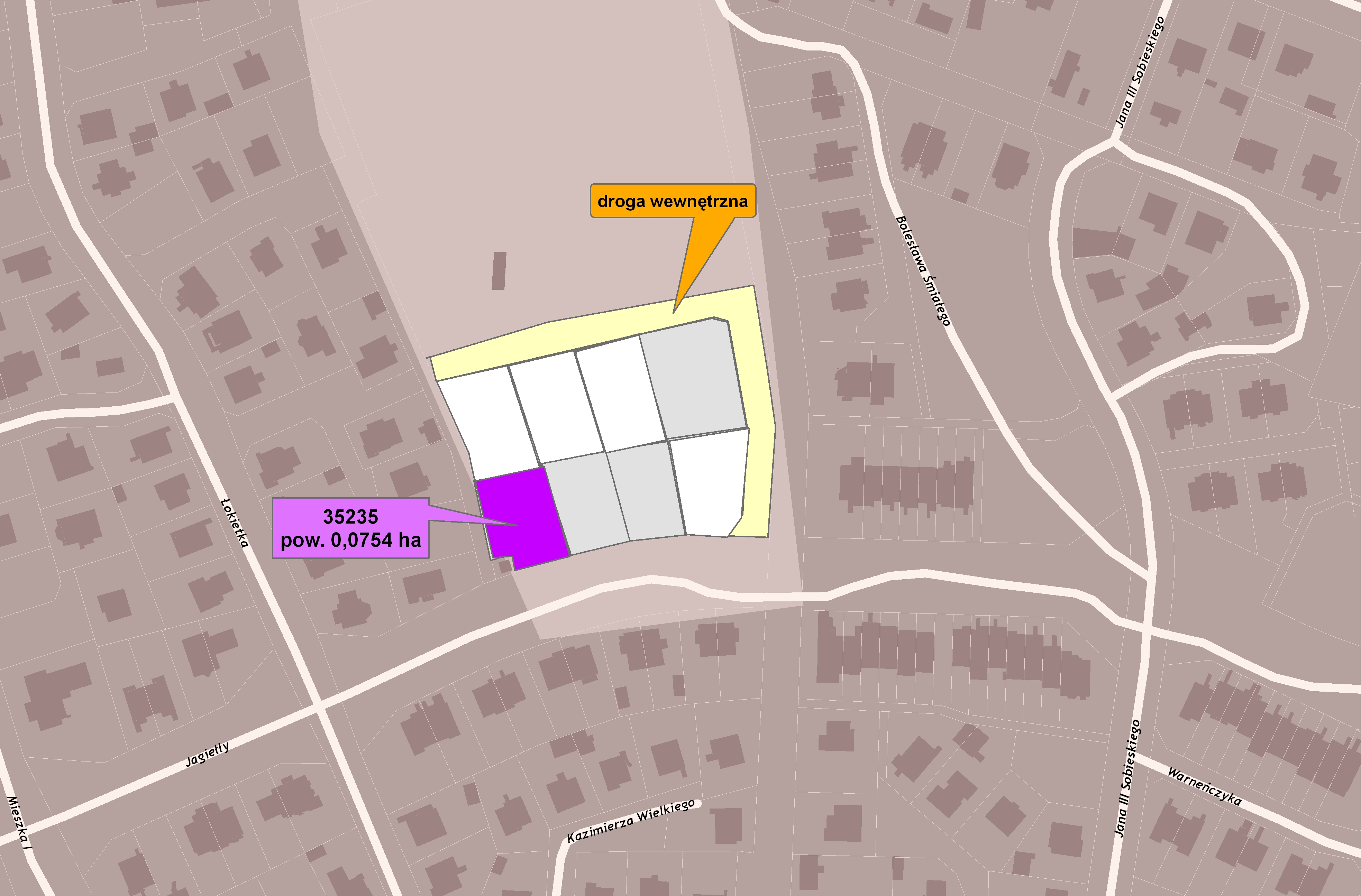 - oznaczona numerem 35235 o powierzchni 0,0754 ha, położona w Suwałkach przy ul. Jagiełły. Nieruchomość przeznaczona jest na cele zabudowy mieszkaniowej jednorodzinnej, wolnostojącej. Szczegółowe warunki zabudowy określone są w Miejscowym Planie Zagospodarowania Przestrzennego zatwierdzonym Uchwałą Nr XXVIII/297/2012 Rady Miejskiej w Suwałkach z dnia 28.11.2012 roku. Nieruchomość posiada urządzoną księgę wieczystą nr SU1S/00016734/2.