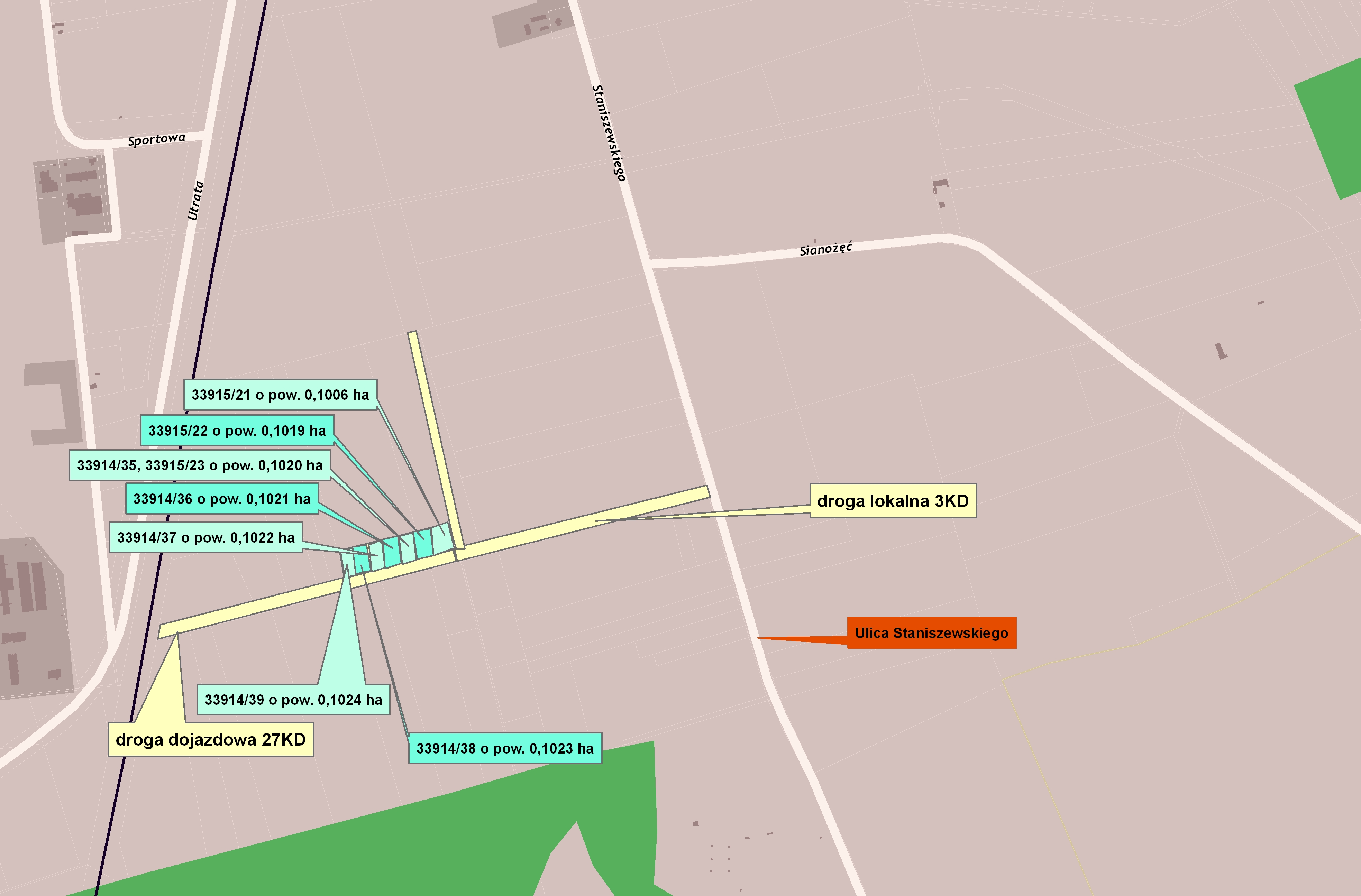 - oznaczona działką nr 33915/21 o powierzchni 0,1006 ha, położona w Suwałkach przy ul. Staniszewskiego, posiadająca urządzoną księgę wieczystą nr SU1S/00006299/7. Nieruchomość przeznaczona jest na cele zabudowy mieszkaniowej jednorodzinnej wolnostojącej. Szczegółowe warunki zabudowy zawarte są w miejscowym planie zagospodarowania przestrzennego zatwierdzonym Uchwałą Nr XL/440/2013 Rady Miejskiej w Suwałkach z dnia 25.09.2013 roku. Obsługę komunikacyjną przewiduje się z projektowanej drogi dojazdowej, oznaczonej na planie 27KD. Obecnie wydzielona geodezyjnie droga dojazdowa 27KD jest nie urządzona, uzbrojona jest w sieć wod-kan.