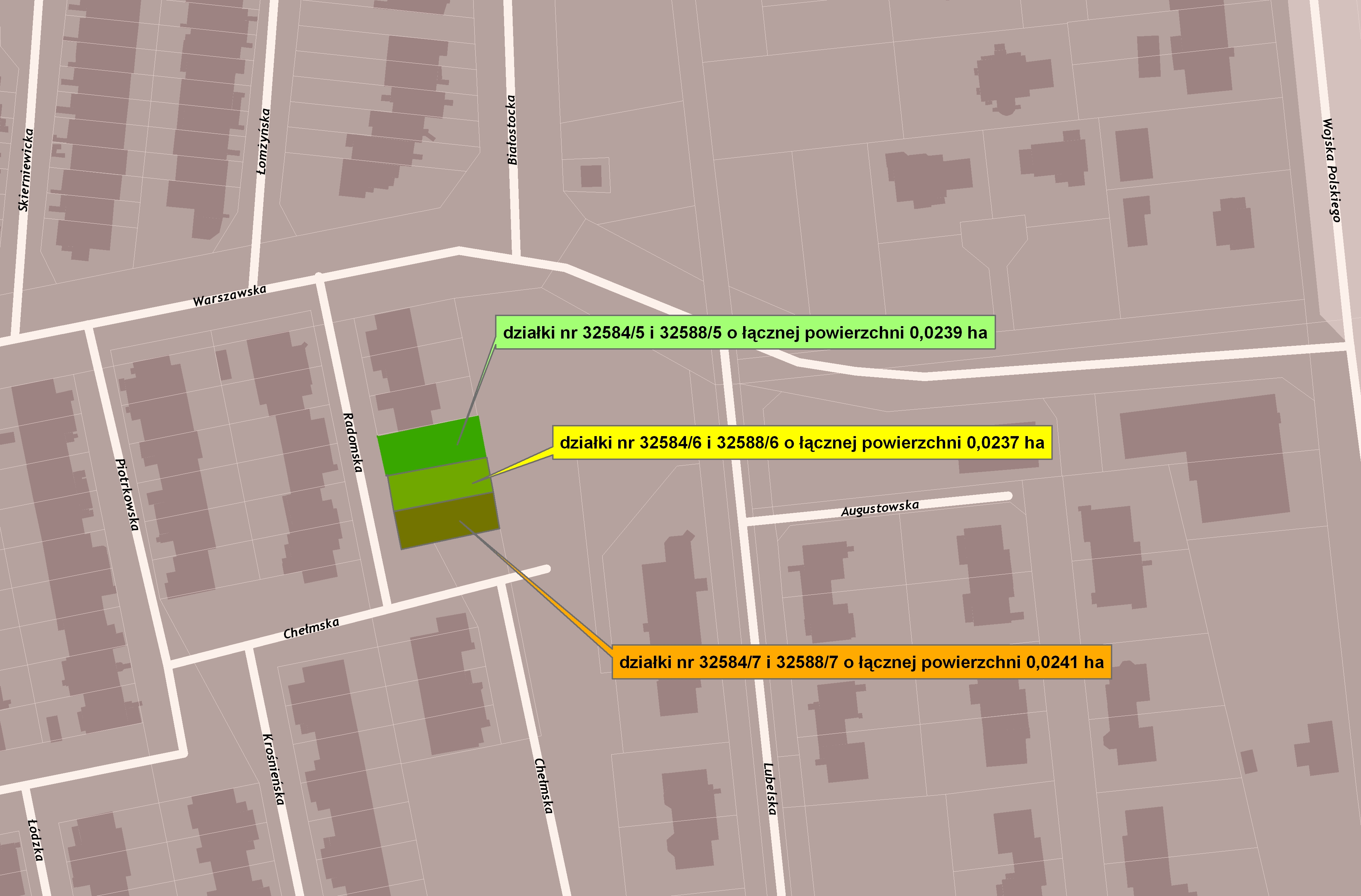 3. oznaczona działkami nr 32584/5 i 32588/5 o łącznej powierzchni 0,0239 ha, położona w Suwałkach przy ul. Radomskiej, posiadająca urządzoną księgę wieczystą SU1S/00030587/0. Nieruchomość przeznaczona jest do sprzedaży w drodze przetargu na cele zabudowy mieszkaniowej jednorodzinnej szeregowej. Szczegółowe warunki zabudowy zawarte są w miejscowym planie zagospodarowania przestrzennego zatwierdzonym Uchwałą Nr XXVII/284/2012 Rady Miejskiej w Suwałkach z dnia 24.10.2012 roku. Na działkach znajdują się drzewa i krzewy. W przypadku kolidowania roślinności z nową inwestycją, nabywca usunie ją na koszt własny.