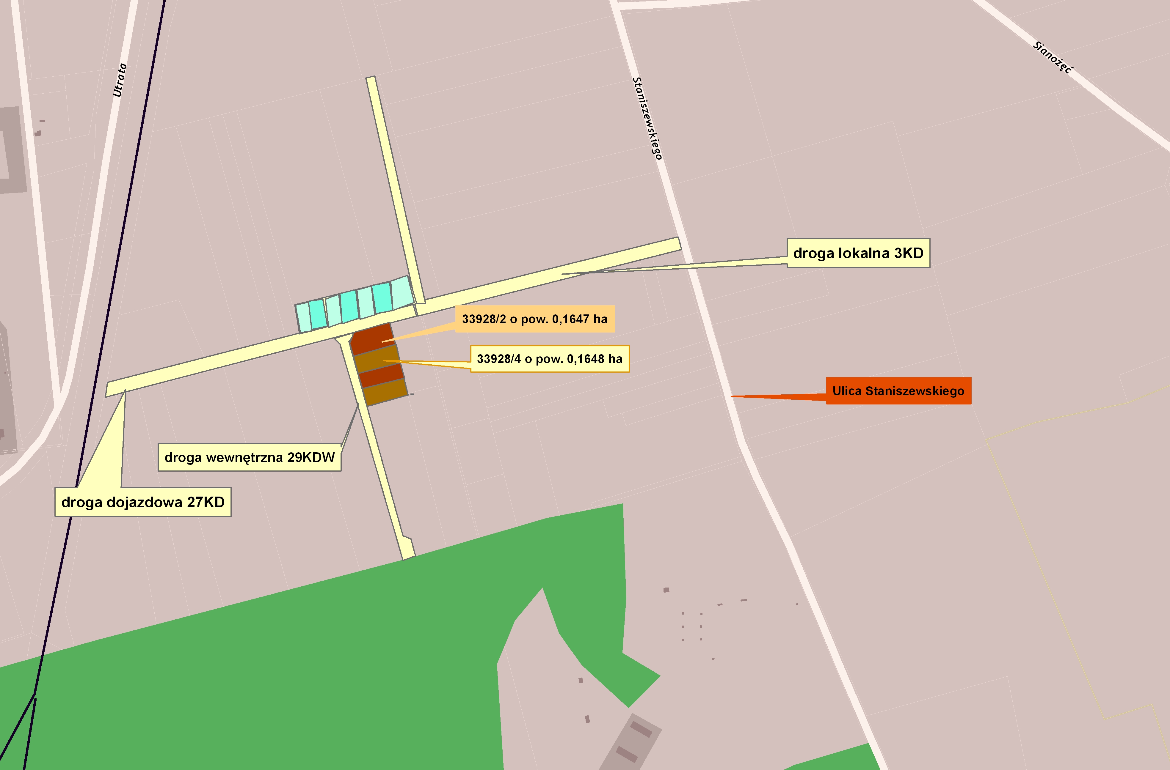2. oznaczona działką nr 33928/4 o powierzchni 0,1648 ha, położona w Suwałkach przy ul. Staniszewskiego, posiadająca urządzoną księgę wieczystą nr SU1S/00040509/3. Nieruchomość przeznaczona jest na cele zabudowy mieszkaniowej jednorodzinnej wolnostojącej. Szczegółowe warunki zabudowy zawarte są w miejscowym planie zagospodarowania przestrzennego zatwierdzonym Uchwałą Nr XL/440/2013 Rady Miejskiej w Suwałkach z dnia 25.09.2013 roku. Obsługę komunikacyjną przewiduje się z projektowanej drogi wewnętrznej, oznaczonej na planie 29KDW. Obecnie wydzielona geodezyjnie droga wewnętrzna 29KDW jest nie urządzona, uzbrojona jest w sieć wod-kan.