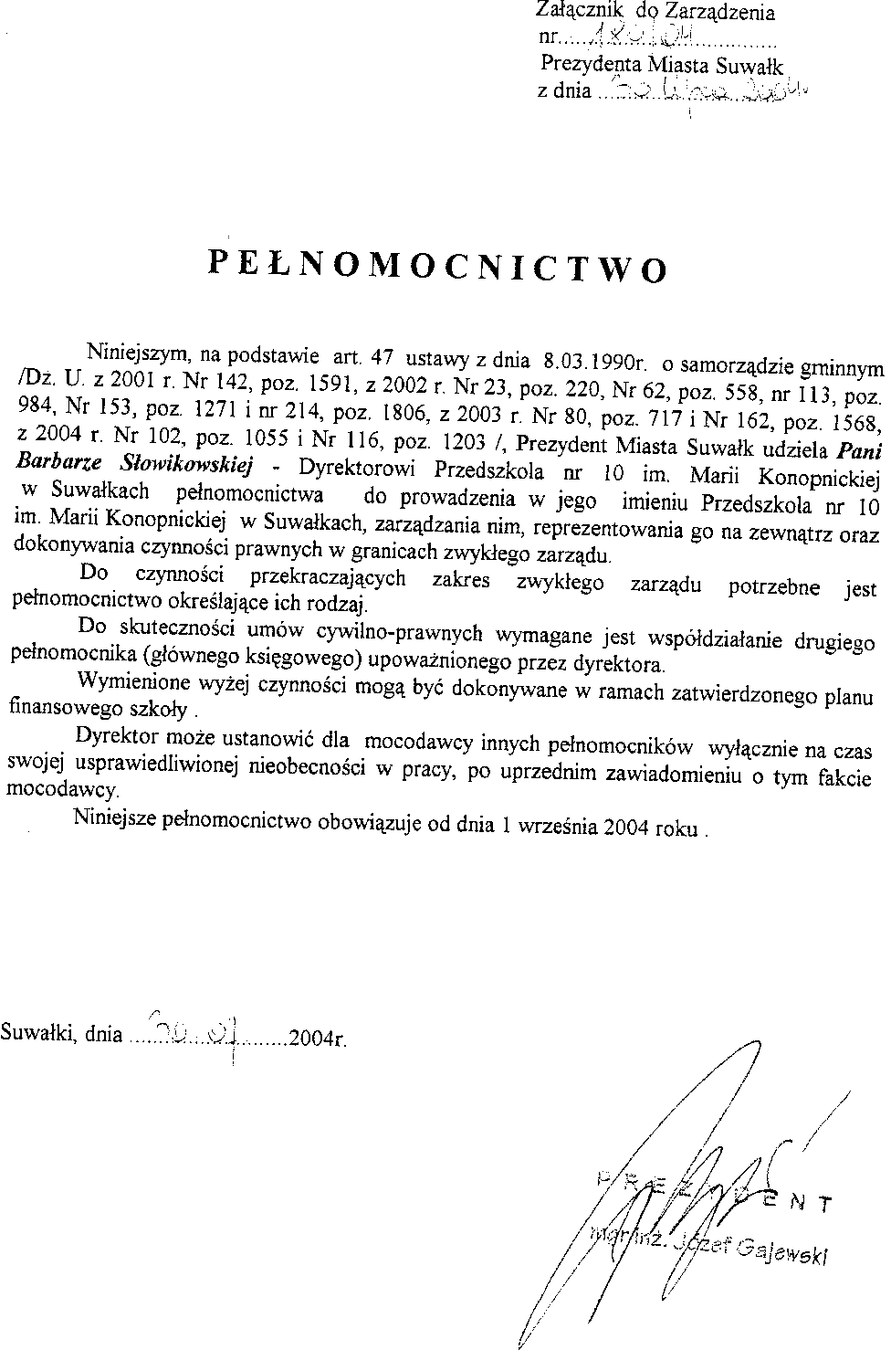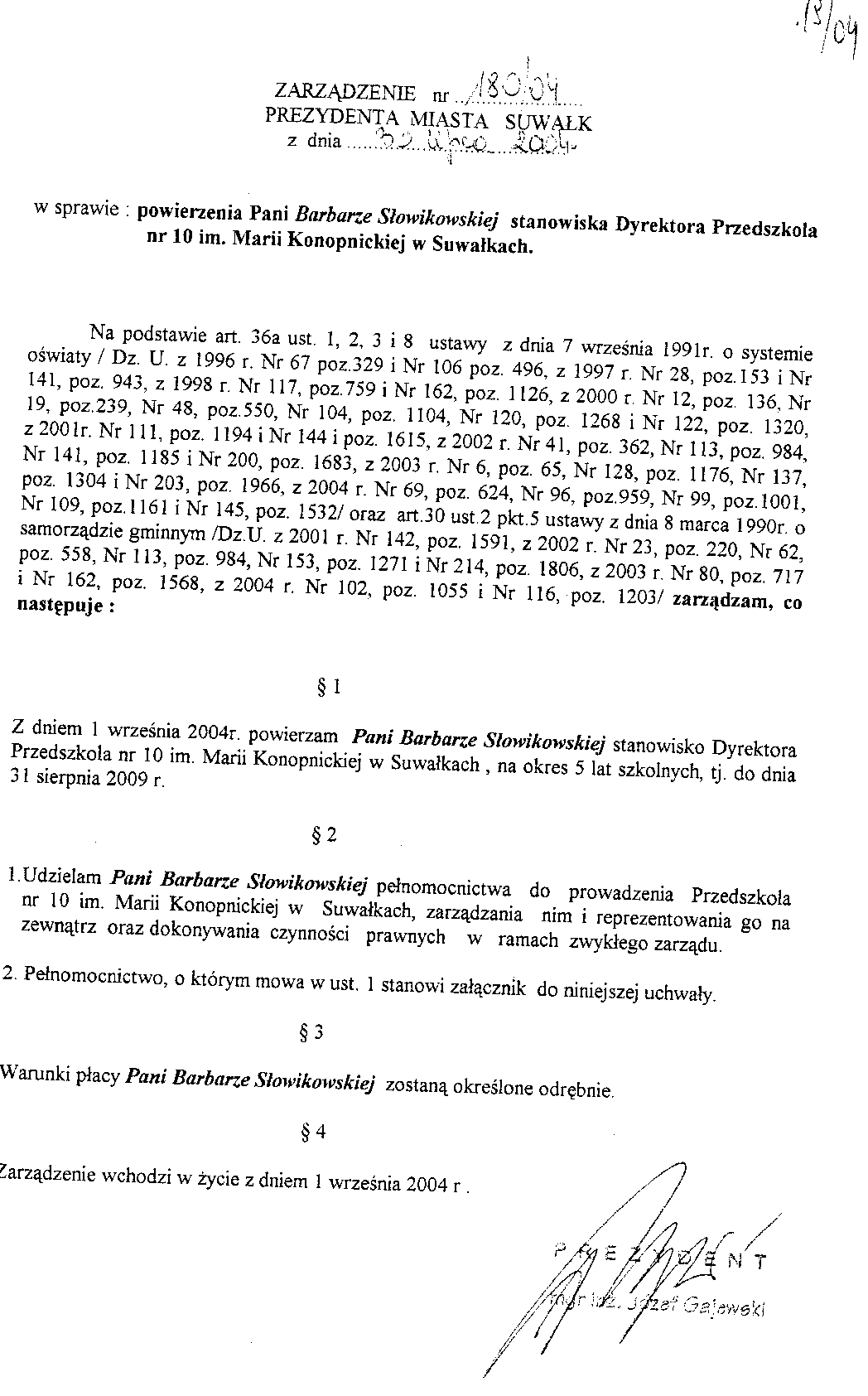 | Tytuł | w sprawie powierzenia Barbarze Słowikowskiej stanowiska dyrektora Przedszkola nr 10 im. Marii Konopnickiej w Suwałkach. |