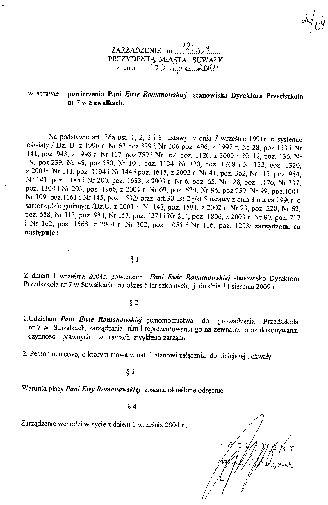 | Tytuł | w sprawie powierzenia Ewie Romanowskiej stanowiska dyrektora Przedszkola nr 7 w Suwałkach. |