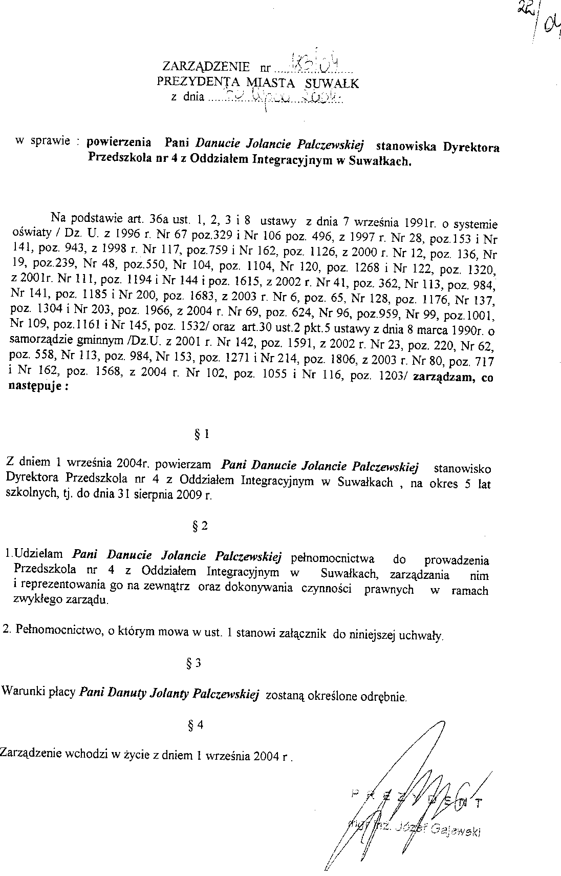 | Tytuł | w sprawie powierzenia Danucie Jolancie Palczewskiej stanowiska dyrektora Przedszkola nr 4 z Oddziałem Integracyjnym w Suwałkach. |