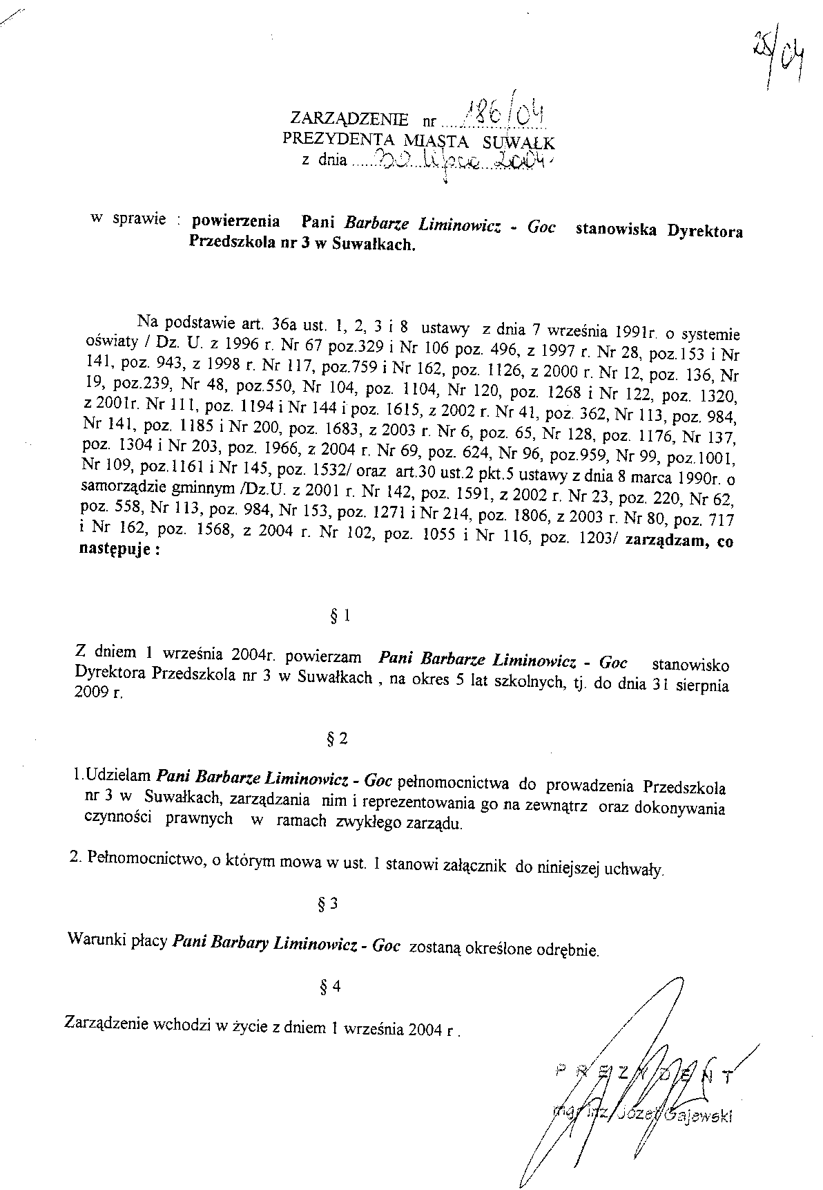 | Tytuł | w sprawie powierzenia Barbarze Liminowicz-Goc stanowiska dyrektora Przedszkola nr 3 w Suwałkach. |