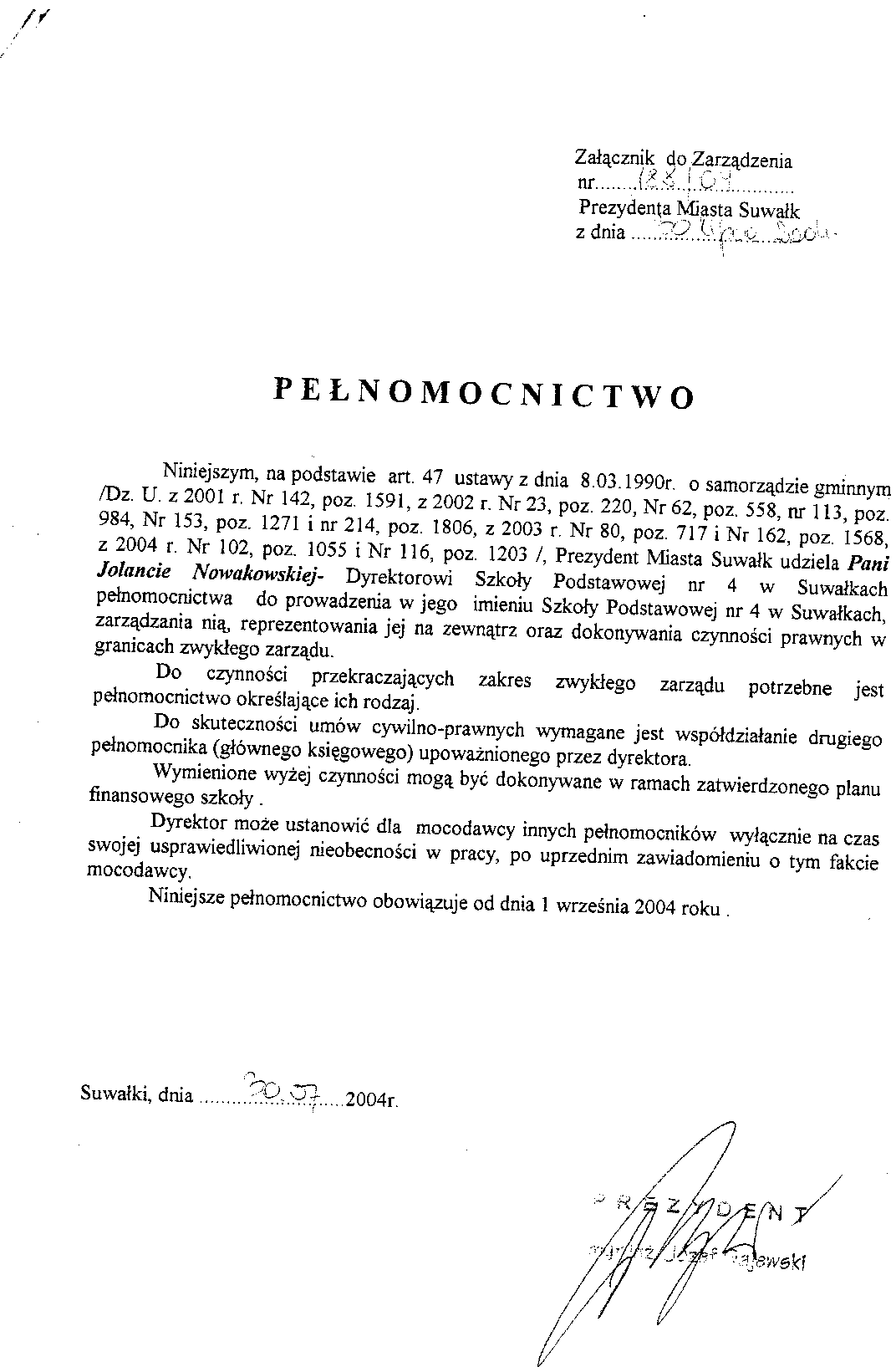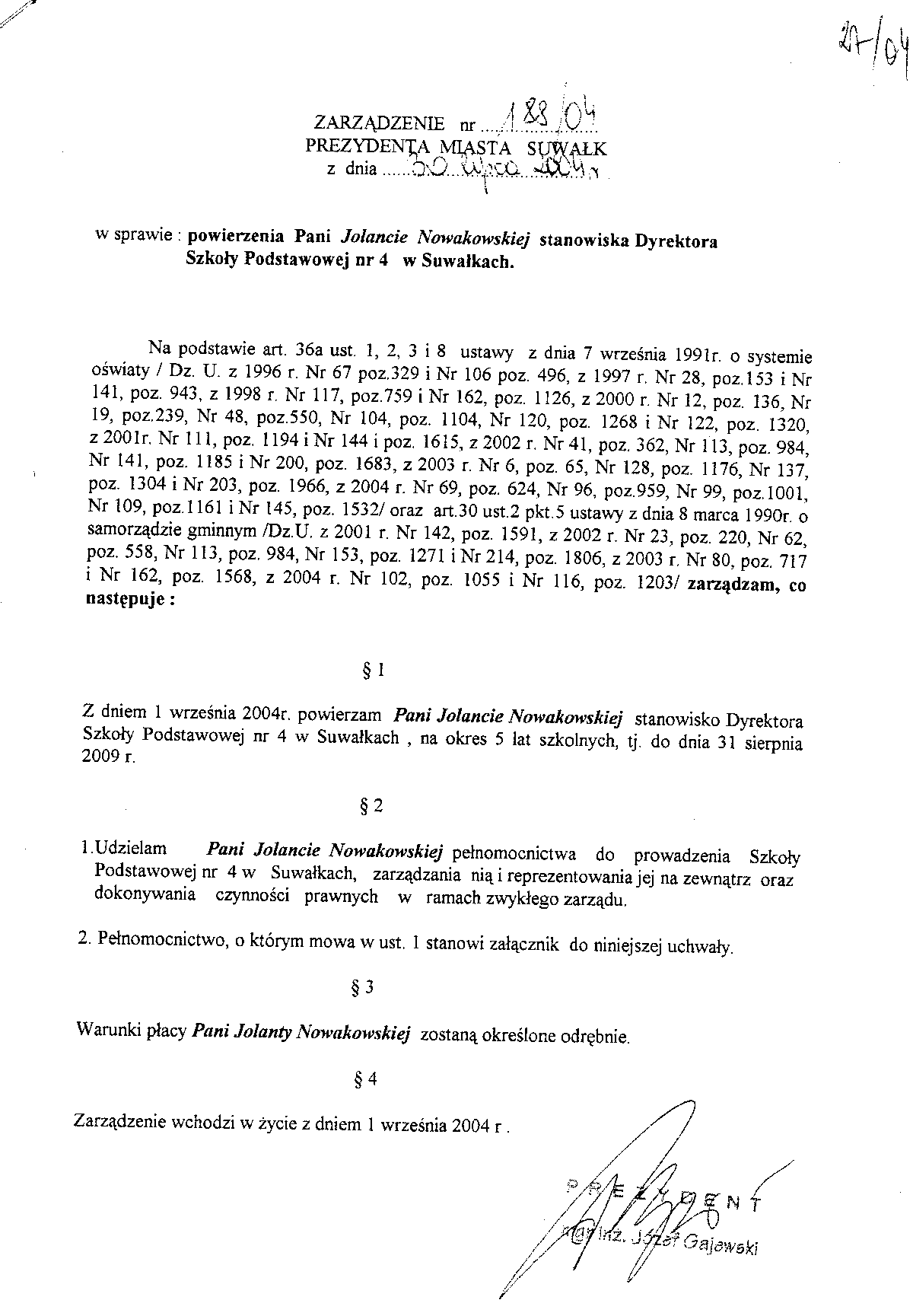 | Tytuł | w sprawie powierzenia Jolancie Nowakowskiej stanowiska dyrektora Szkoły Podstawowej nr 4 w Suwałkach. |