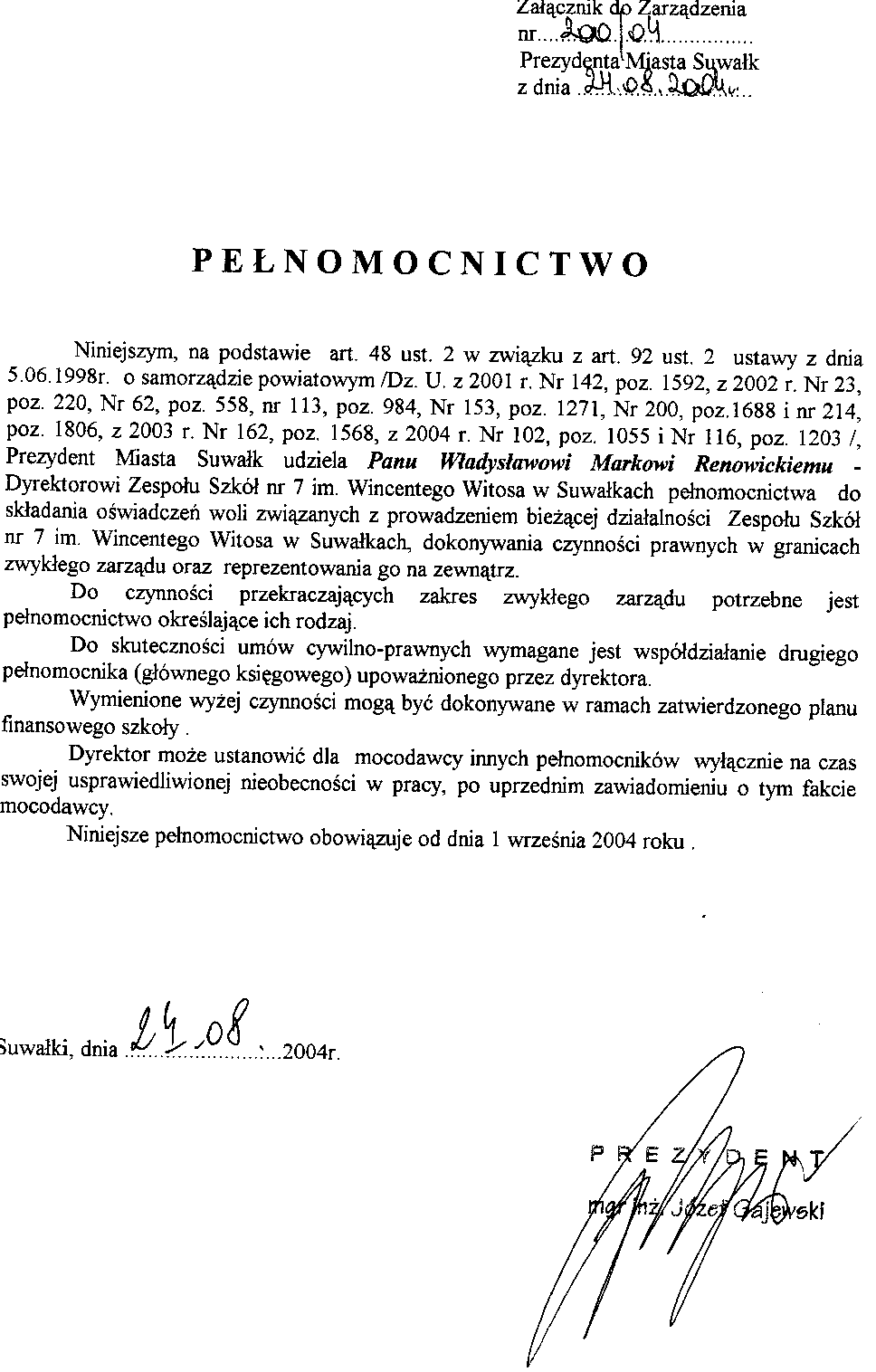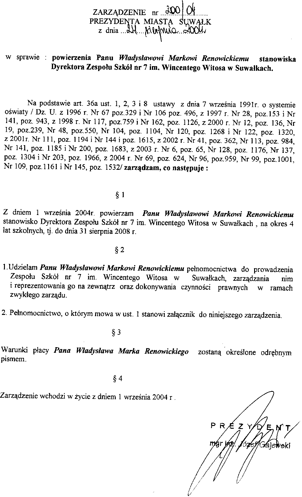 | Tytuł | w sprawie powierzenia Panu Wladyslawowi Markowi Renowickiemu stanowiska Dyrektora Zespołu Szkół nr 7 im. Wincentego Witosa w Suwałkach. |